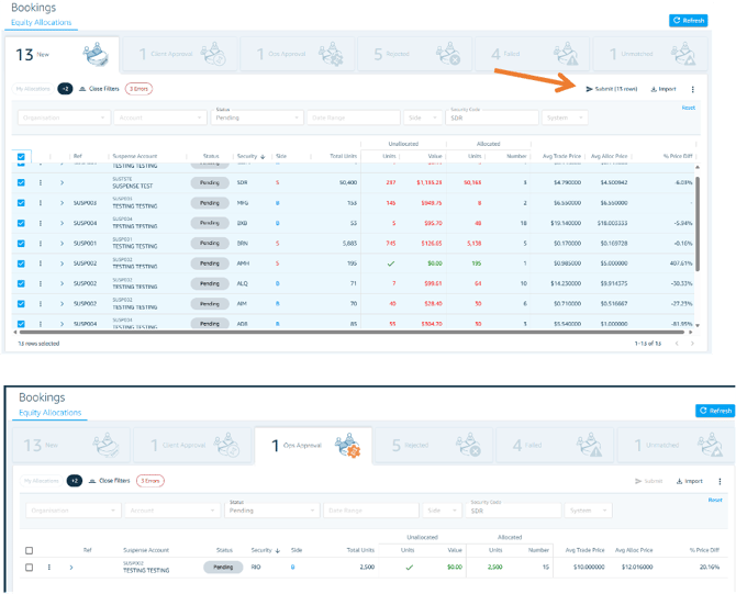 - Use the checkboxes on the lefthand side to select multiple orders with allocations to be submitted