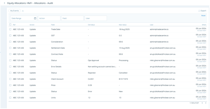 Audit data is available for each bulk order and allocation. To access it, select the relevant record, click "More Actions" and then select "Audit". The audit panel will open and display the audit details for the selected record.