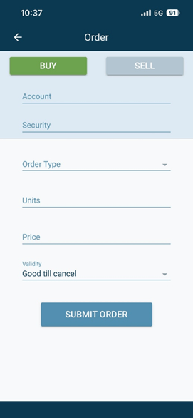 To place an order on TC Mobile, navigate to the Menu and "Security Search", and then click the + symbol or Buy/Sell button.